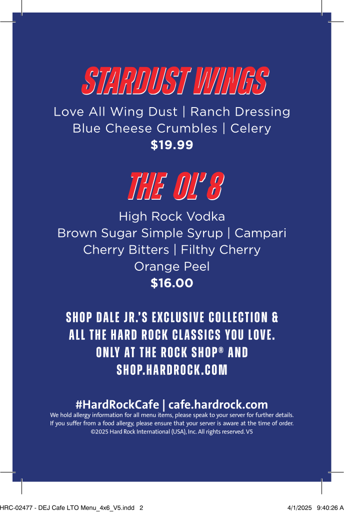 Satisfy your championship appetite with our jumbo Stardust Wings. Toast to your favorite drivers with the legendary Dale Earnhardt Jr. "OL' 8" drink special. Shop our exclusive Dale Earnhardt JR. merchandise only available at select Hard Rock Cafe locations for a limited time.